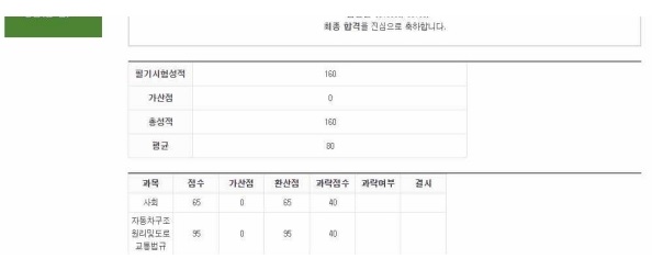 4. 드디어 시험 40분안에 모든걸 쏟아야하는 직렬로써 실수 한 두개에 당락이 되므로 매우 긴장하였지만 인강을 처음 들을 때 크게 목차부터 공부해서 문제가 나오면 바로 어떤 부분에 대해 묻는지 알 수 있었습니다. 도로교통법규 문제는 다 맞췄습니다! 암기 100%과목이라 청킹이 매우 매우 도움이 되었습니다. 그리고 최신 개정된 사항까지 정확하게 나왔습니다. 제가 많이 실 수한건 사회과목인데요 사회는 독학을 해서 그런가봅니다. 3과목 패키지를 들을 껄 후회했 습니다. 하지만 2과목 20문제 중 1개만 틀려 최종합격까지 할 수 있었습니다. 단기간에 빠 르게 학습효율을 올려주는 강사님들 정말 감사합니다. 그리고 왜 1타 강사님들을 들어야 하 는 이유는 타 인강에 비하여 학습기간을 줄여주는 것, 오랫동안 머릿속에 남기게 해준다는 것입니다.