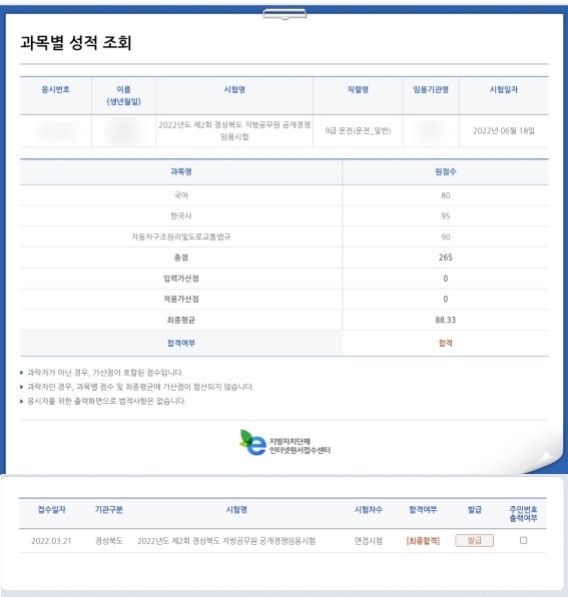 2022년 경북 지방직 공채 합격자 송** 님(37세, 남) 작성자 : 티치온 운전직 작성일자 : 2022-10-19 14:30:35조회수 396 |