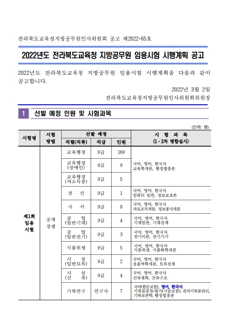 2022년도 전라북도교육청 지방공무원 임용시험 시행계획 공고