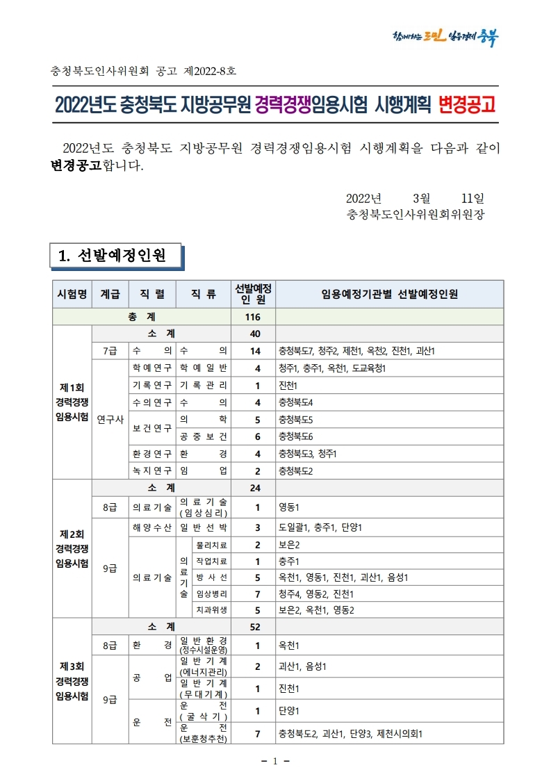 2022년도 충청북도 지방공무원 경력경쟁임용시험 시행계획 변경공고