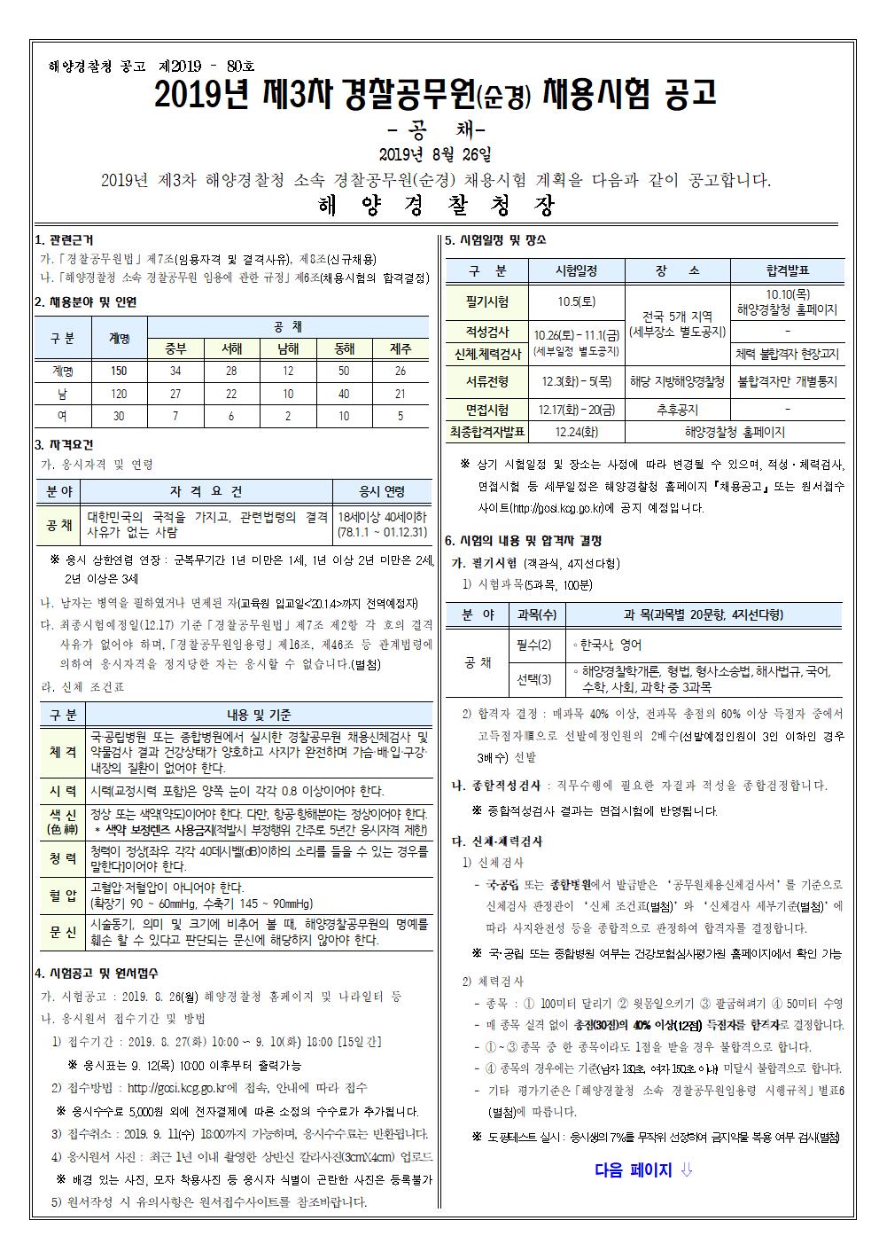 2019년 제3차 해양경찰공무원(공채) 채용 공고
