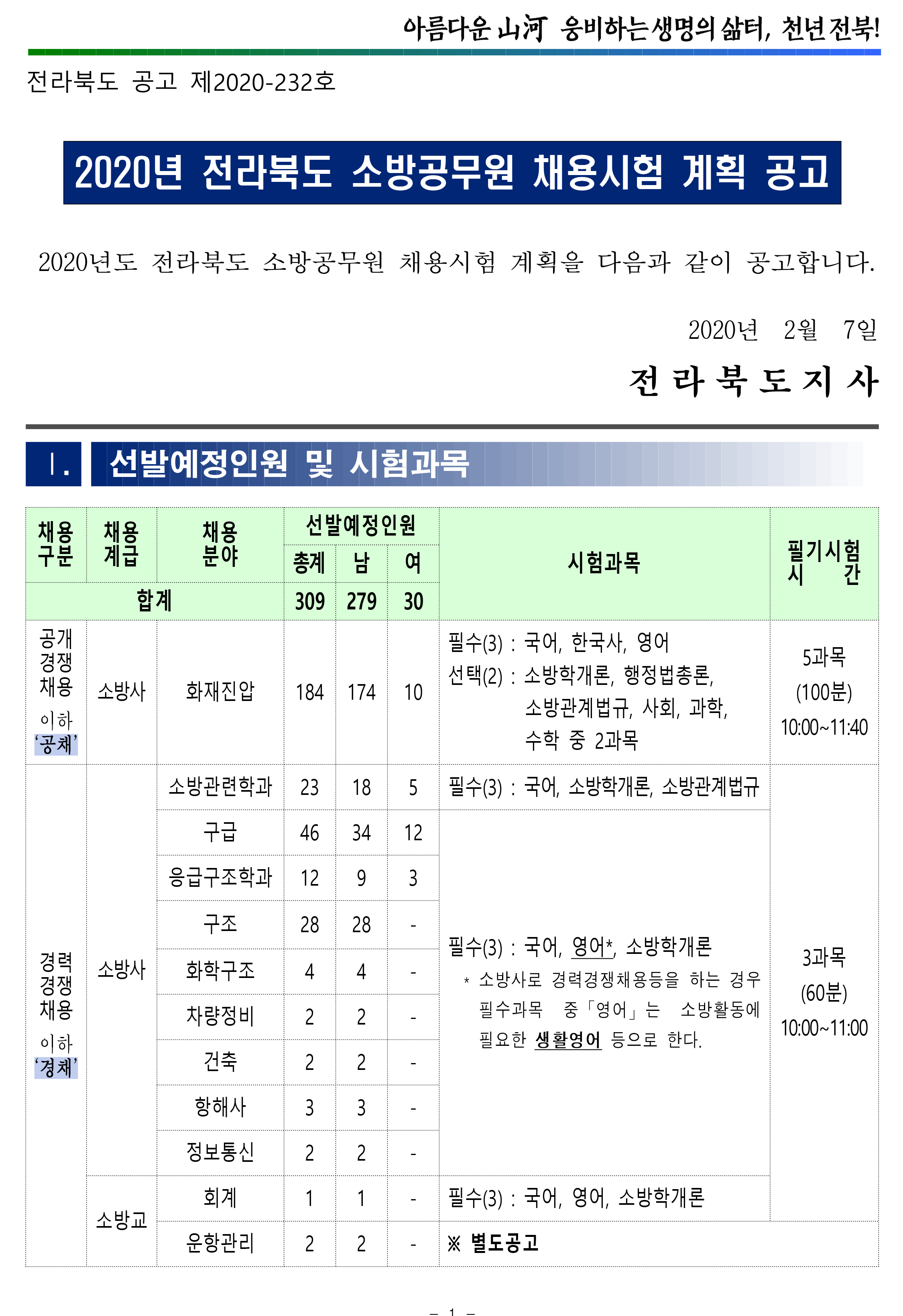 [2020] 전라북도 소방공무원 채용시험 시행계획 공고