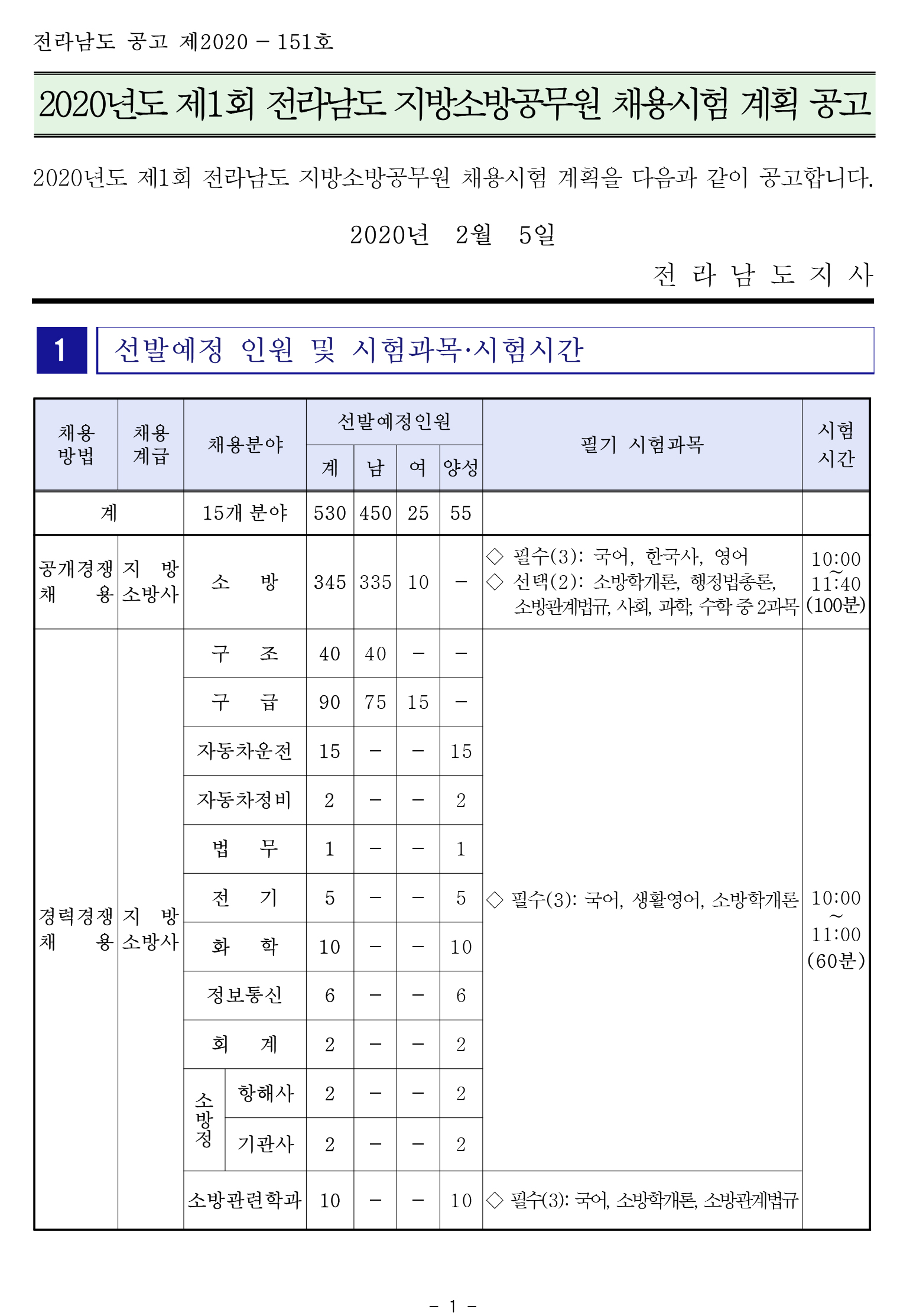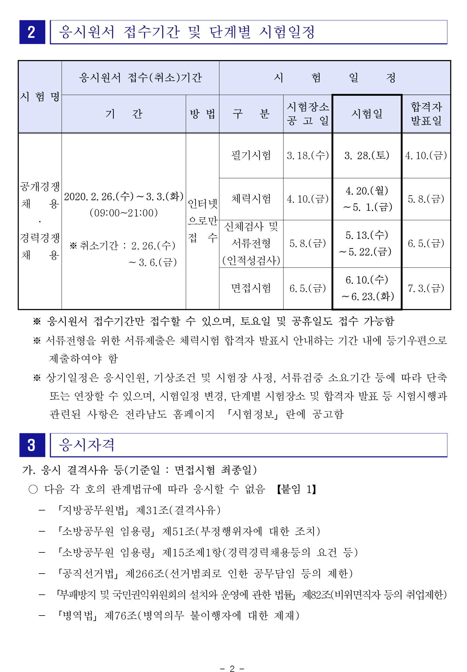 [2020] 전라남도 소방공무원 채용시험 시행계획 공고