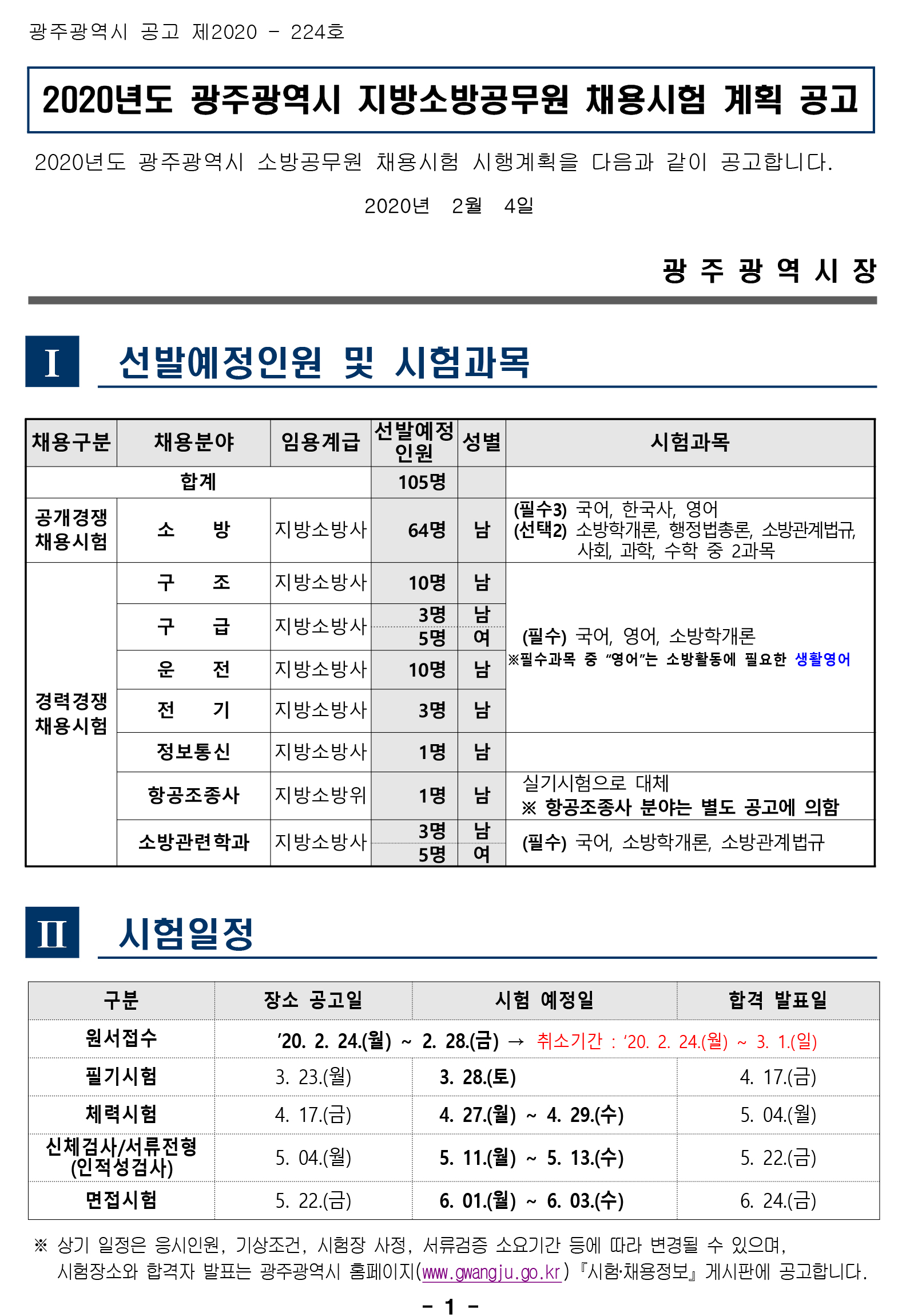 [2020] 광주광역시 소방공무원 채용시험 시행계획 공고