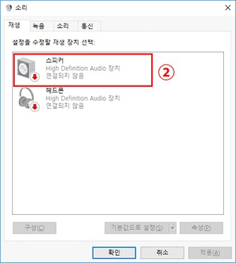 2. [재생] 탭에서 보이는 '스피커'를 선택해주시고, [속성]버튼을 클릭하세요.