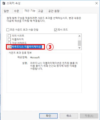 3. [개선 기능] 탭으로 이동하여 '라우드니스 이퀄라이제이션' 메뉴를 선택하신 후 [확인]버튼을 클릭하세요.