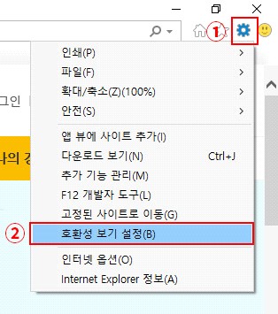1. 인터넷 익스플로러를 실행 후 오른쪽 상단 '톱니바퀴' 클릭 후 [호환성 보기 설정]으로 들어갑니다.