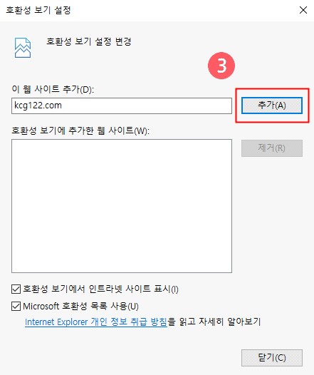 2. [호환성 보기 설정]에서 이 웹사이트 추가에 'kcg122.com'을 입력 후 추가합니다.