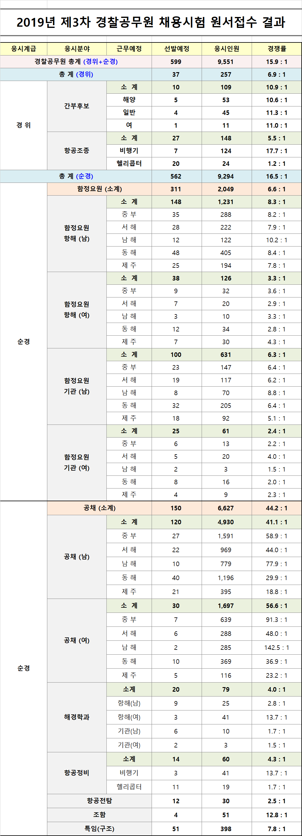 2019년 제3차(2020년 간후 선발시험 포함) 해양경찰청 소속 경찰공무원 채용 원서접수 결과 알림 작성자 : 캠버스 해양경찰 작성일자 : 2019-09-14 15:44:02조회수 1026 |