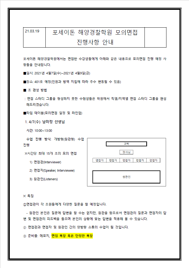 20년 제 3차 해양경찰 채용 시험을 준비하는 수험생들의 합격을 기원하며 포세이돈 해양경찰 학원에서는 다음과 같이 모의면접 진행 사항들을 안내 합니다.