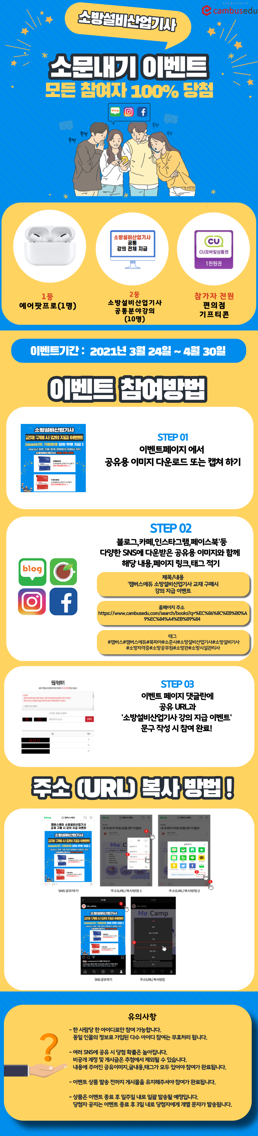 ※ 공유이미지는 첨부파일을 확인하시기 바랍니다. [ 공유이미지와 함께 들어갈 내용 ] 1. '캠버스에듀 소방설비산업기사 교재 구매 시 강의 지급 이벤트' - 제목&내용 2. 링크 적어주기 - https://www.cambusedu.com/search/books?q=%EC%86%8C%EB%B0%A9%EC%84%A4%EB%B9%84 3. 태그 적기 - #캠버스#캠버스에듀#북피아#소준사#소방설비산업기사#소방설비기사#소방자격증#소방공무원#소방관#소방시설관리사 [이벤트 유의사항] - 한 사람당 한 아이디로만 참여 가능합니다. 동일 인물의 정보로 가입된 다수 아이디 참여는 무효처리 됩니다. - 여러 SNS에 공유 시 당첨 확률은 높아집니다. 비공개 계정 및 게시글은 추첨에서 제외될 수 있습니다. 내용에 주어진 공유이미지,글내용,태그가 모두 있어야 참여가 완료됩니다. - 이벤트 상품 발송 전까지 게시물을 유지해주셔야 참여가 완료됩니다. - 상품은 이벤트 종료 후 일주일 내로 일괄 발송될 예정입니다.
