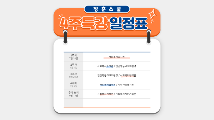 [필독 공지] 3주차 수업 연기 및 추가 보강 확정 안내 안녕하세요. 정훈스쿨입니다. 일정 상 내일 8월 21일은 "4주특강"의 3주차 수업이 진행되는 날입니다. 하지만 현재 교수님의 건강이 좋지 않은 관계로 3주 수업을 한 주 연기하기로 하였습니다. 특강을 기다리시고 열심히 공부하고 계시는 모든 선생님들께 진심으로 사과의 말씀을 올립니다. 그와 함께 현재 특강 진도가 많이 나가지 못하여 특강 4주 기간 내 완강이 어려울 듯 하여 추가로 1주 더 특강을 진행하기로 확정 하였습니다. ![]() 교수님 건강의 빠른 쾌류를 기원하며, 특강 참여 선생님들께 다시 한번 사과의 말씀 드립니다. 감사합니다. |