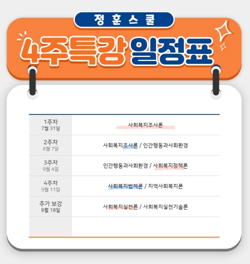 #필독공지 "4주특강" 3주차 수업 추가 연기 안내 안녕하세요. 정훈스쿨입니다. 내일 8월 28일 3주차 수업이 진행되기로 하였으나, 현재 교수님의 건강이 좋지 않은 관계로 3주 수업을 한 주 더 연기하기로 하였습니다. 특강을 기다리시고 열심히 공부하고 계시는 모든 선생님들께 진심으로 사과의 말씀을 드리며, 대신 기존 1~2주차 영상을 특강 참여 신청자분들 모두에게 다시 열어드리기로 하였습니다. 특강 링크는 기존 참여 신청자분들에 한해 금일 안내 문자 발송이 될 예정입니다. 일정 및 매 주차 별 수업 영역은 일정표를 참고 해 주시면 감사하겠습니다. 교수님 건강의 빠른 쾌류를 기원하며, 특강 참여 선생님들께 다시 한번 사과의 말씀 드립니다. 감사합니다. ![]() |