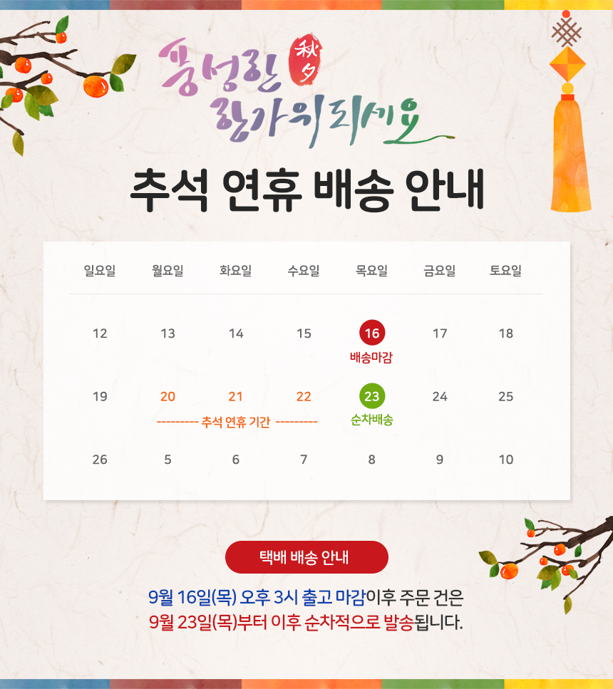 2. 택배 발송 안내 1) 택배사 추석 물량 증가로 일반 배송보다 2~3일 정도 배송 지연이 예상됩니다. (제주, 도서산간지역은 배송기간 더 소요됩니다) 2) 9월 16일(목) 오후 3시 이전 주문 : 9월 16일(목) 당일 발송 (추석연휴 이전에 배송예정) 3) 9월 16일(목) 오후 3시 이후 주문 : 9월 23일(목) 이후 순차 발송 예정 4) 제주, 도서산간지역은 태풍 찬투북상으로 인해 9월 11일(토) 배송이 마감되었습니다. 해당 주문 건은 3) 항목의 기한에 맞춰 배송될 예정입니다.