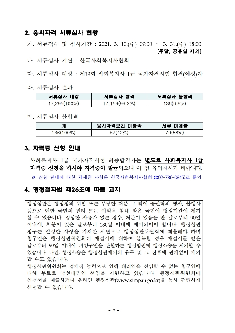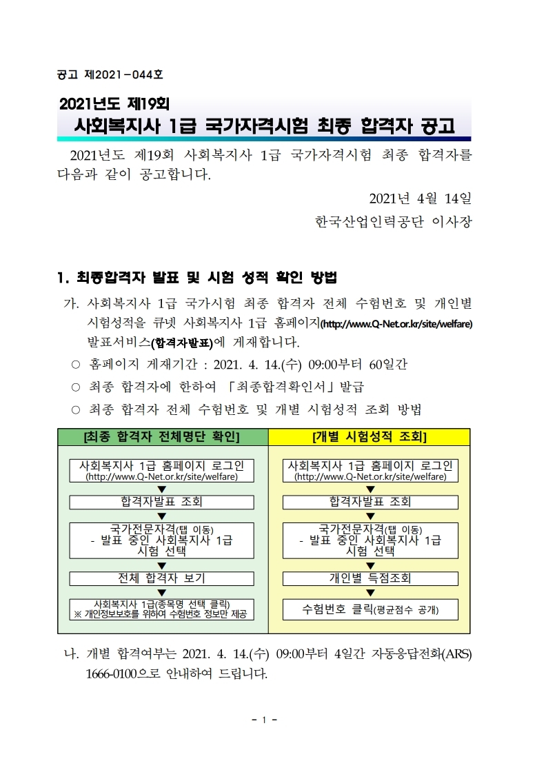 2021년도 제19회 사회복지사 1급 국가자격시험 최종 합격자 공고