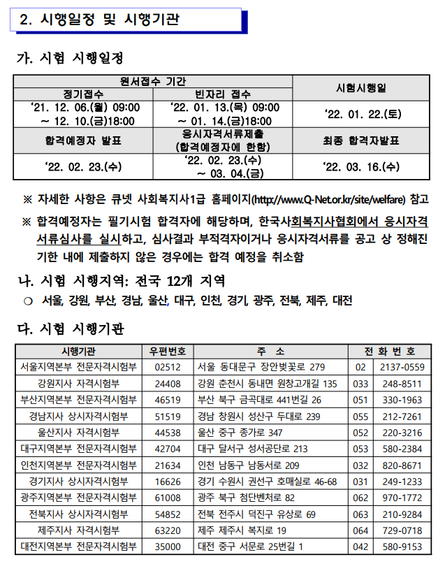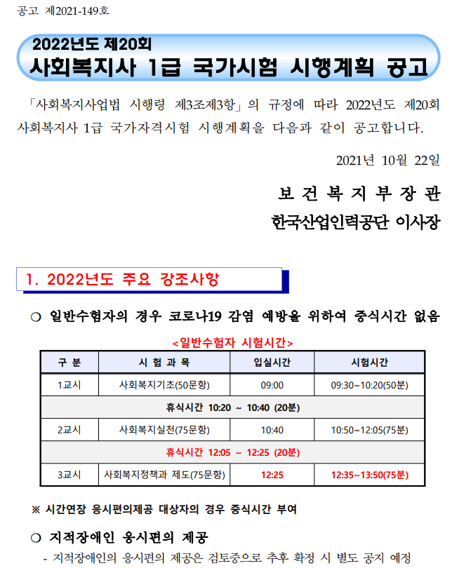 2022년 사회복지사 1급 자격시험 시험계획 공고