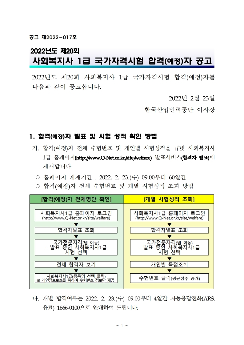 2022년도 제20회 사회복지사1급 국가자격시험 합격(예정)자 공고