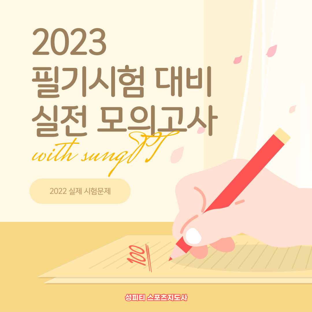 [이벤트] 필기시험 원서접수 시작! 실전 모의고사 배포 작성자 : 성피티 스포츠지도사 작성일자 : 2023-03-29 16:09:52조회수 563 |