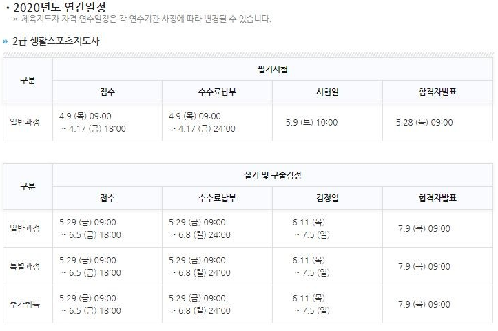 2020 생활스포츠지도사 2급 시험일정