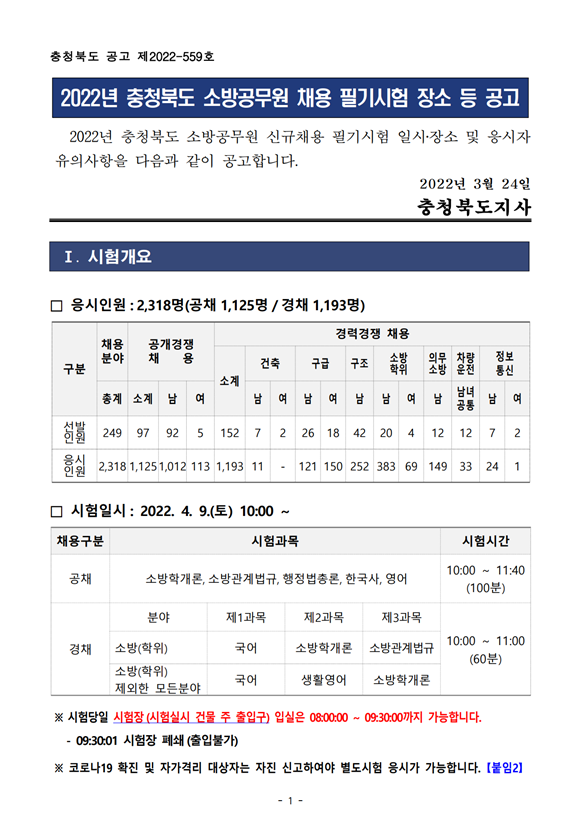 ★ 2022년 충북 소방공무원 신규채용 필기시험 일정 등 공고